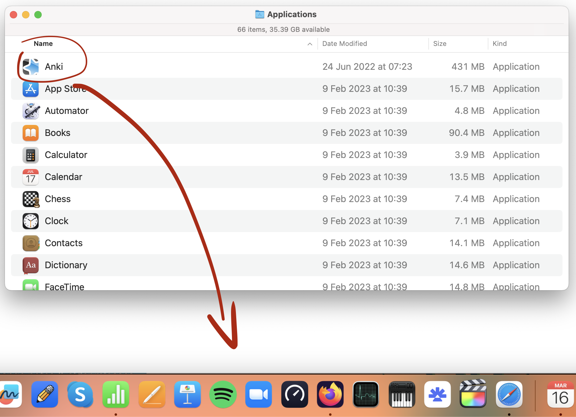 Drag the Anki icon to the right, to the Applications folder. Then, double-click the Applications folder. This’ll open another window: